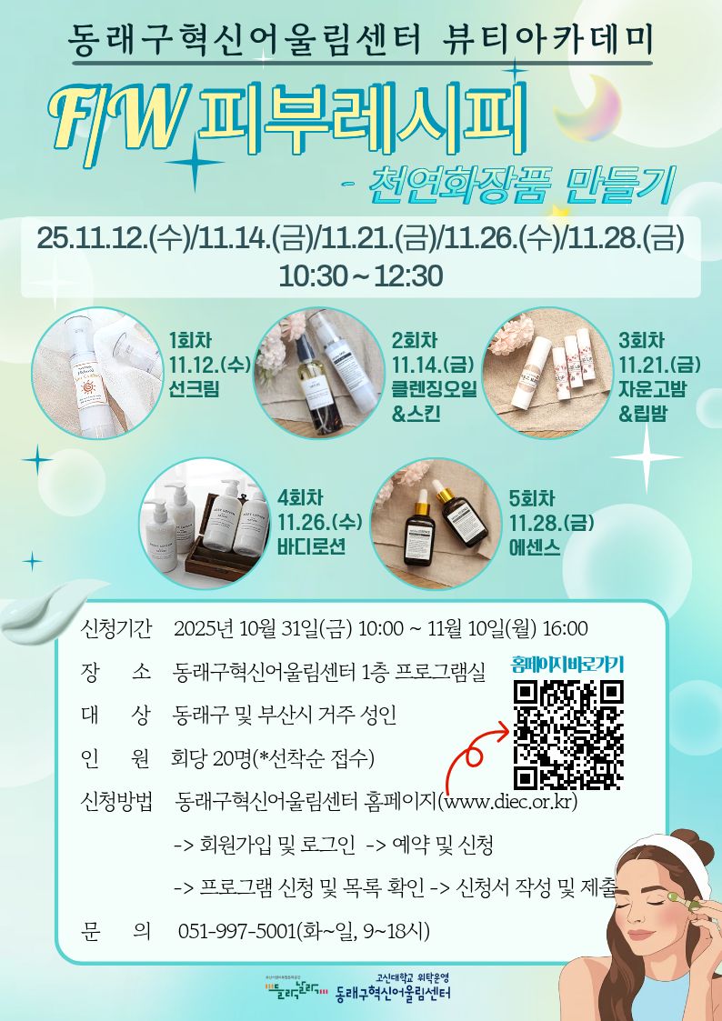 - 이전글[11/14, 성인] F/W 피부레시피 - 천연화장품 만들기(클렌징오일&스킨) 25.10.29